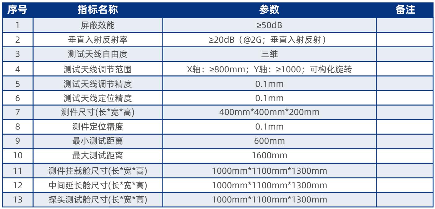 产品介绍:本产品由多节屏蔽箱体自由组合,根据测试需要自由改变测距,图中左端有三维扫描架,右端为被测件挂架,可单套使用,也可以两套组合使用。